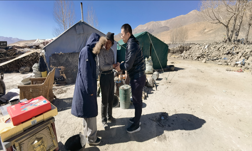 帐篷里并不冷,两张单人床分置两边,中间一个烧着牛粪的炉子煮着酥油茶。炉旁一张桌子上搁着两把暖壶和几个大小花色不一的碗,一口锅、几袋粮食和其他家什挤在一边,最里头一根绳子上挂着晾晒的羊肉。次仁不太会说普通话,示意记者坐下。达瓦从暖壶里倒了一碗酥油茶捧过来。普布吉宗告诉记者,政府已在村头建起了移动板房供临时居住,他们晚上回板房,白天就在这里清理杂物、修缮器具,准备重建。