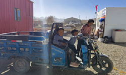 瓦砾堆积,房屋倒塌。寒风掠过残垣,发出空转泵机般的呜咽,觅食的雪雀扑棱着翅膀掠过一排排尚未启封的聚氨酯保温板。几只脏兮兮的小牛见到汽车后慌乱地躲开,一堵用土墩垒起的矮墙半围着两顶帐篷。帐篷前的一块地已被清理干净,露出地基,那是普布吉宗家房子的原址。