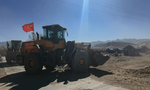 嘎旦村头的漫天风沙里,许多标着“灾区专用车”的工程车辆在不停地穿梭,帮助村民清理废墟。谈起此次救灾,普布吉宗对众多的大型车辆印象深刻,如参与救援的挖掘机、运送物资的大卡车、搭建移动板房的工程车、保障供电的电源车等。